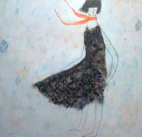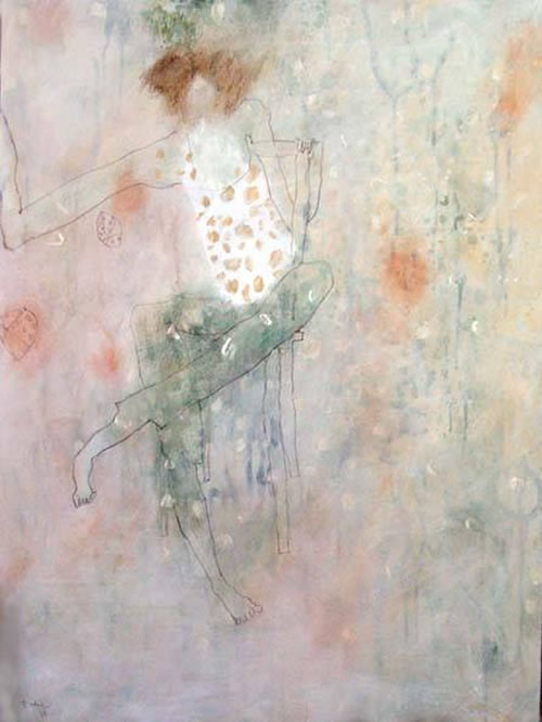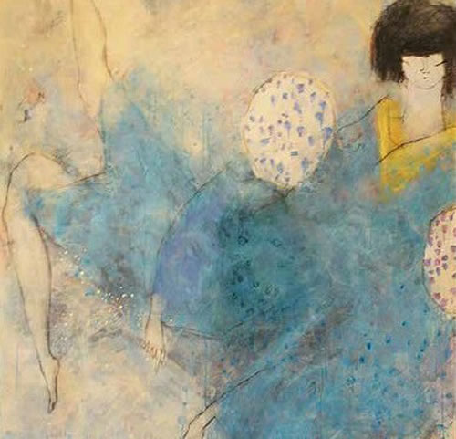 Figuras femeninas elegantes y gráciles que se doblan en posturas inverosímiles, de forzados escorzos, desafiando el orden y la proporción. Algunas de las jóvenes vestidas con Kimono, sostenidas por una espumosa atmósfera volátil, muestran sus largas extremidades que se van afinando hasta confundirse con el espacio como si pretendieran desaparecer y formar parte del universo de lo simbólico.