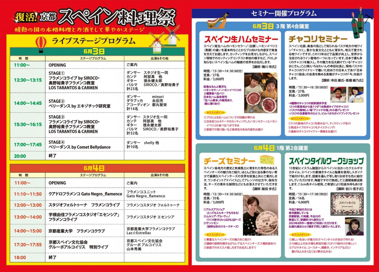 さらにフラメンコライブやベリーダンス、フラメンコユニットによる音楽ライブなどの華やかなステージが繰り広げられる。3日には「スペイン生ハム」と「チャコリ」のセミナー、4日には「チーズ」セミナーと「スペインタイル」のワークショップなども開催され、京都にいながらにしてスペインを感じられる二日間となる。