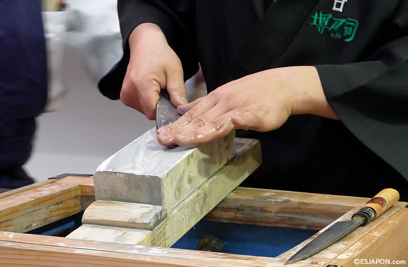 欧州の料理人にもファンの多い和包丁の展示では、両刃である洋包丁と比べて片刃である和包丁は特有の研ぎ方があり、西洋の料理人には研ぎ方が分からずに、戸棚の奥にしまわれたままになってしまっていることが多いという現状を改善すべく、和包丁の研ぎ方の実演も行われた。