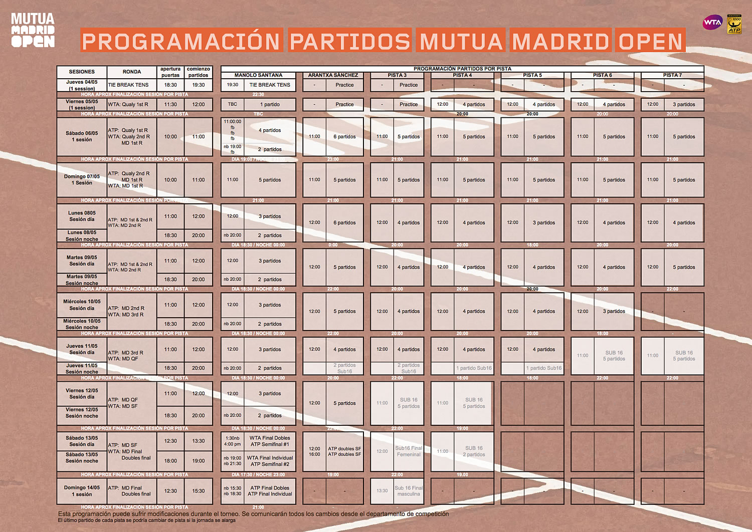 ムトゥア・マドリード・オープンは、男子はATP World Tour マスターズ1000のカテゴリーで、ランキングトップ30の選手には参加義務があり、ドロー数は56S / 28Q / 24D。女子はWTA Tour プレミア・マンダトリーとなり、ドロー数は64S / 32Q / 28Dとなる。