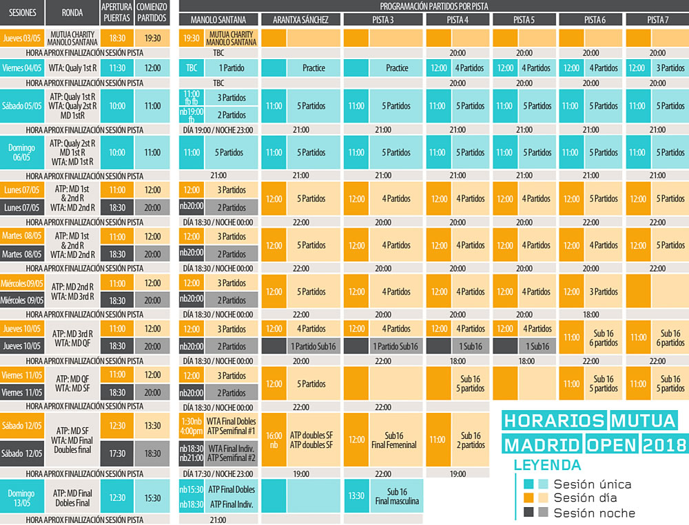 ムトゥア・マドリード・オープンは、男子はATP World Tour マスターズ1000のカテゴリーで、ランキングトップ30の選手には参加義務があり、ドロー数は56S / 28Q / 24D。女子はWTA Tour プレミア・マンダトリーとなり、ドロー数は64S / 32Q / 28Dとなる。