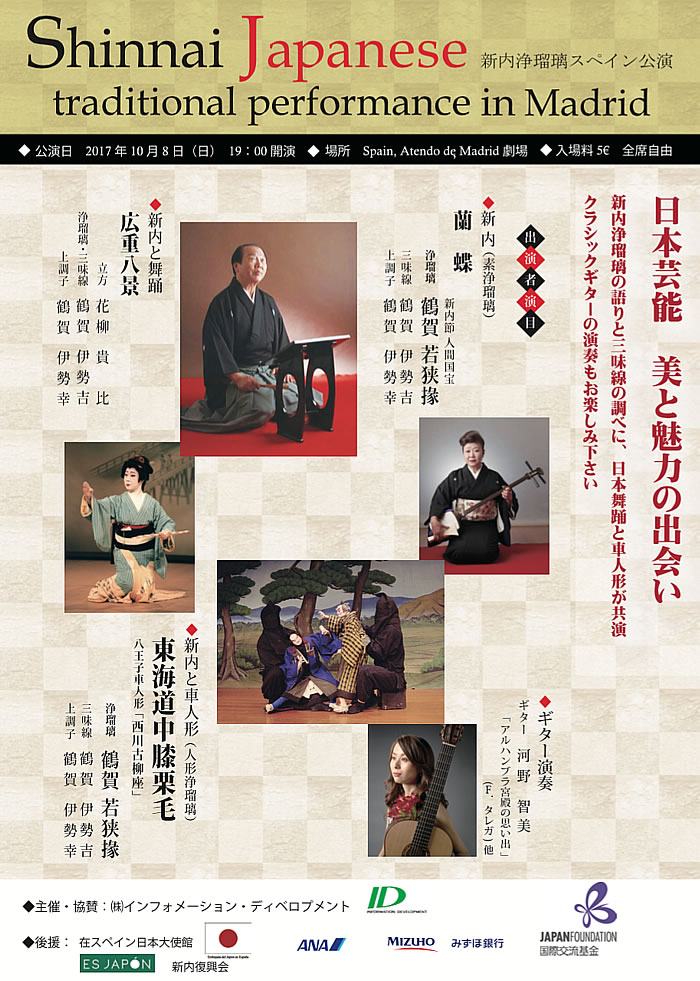 新内節 鶴賀流11代目家元にして人間国宝の鶴賀若狭掾による浄瑠璃、西川古柳座による東京都無形文化財であり無形民族文化財指定の八王子車人形、花柳流 花柳貴比による日本舞踊と、クラシック・ギターリスト河野智美氏によるスペインの伝統音楽クラシックギターの共演が、マドリードのAteneo de Madridにて10月8日 (日) 19:00より、そして前日7日20:00からは、河野智美氏によるギター・リサイタルがQuinta del Sordoにて開催される。