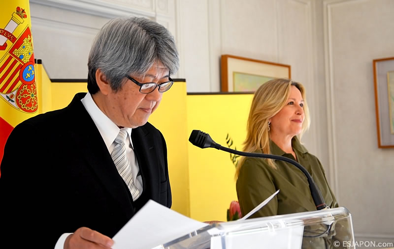 ヒメネス氏は今回の受章と式への列席者に対し感謝の意を表し、同氏の日本に対する親密な思いについて語った。2003年同氏がマドリード市役所のヤング・リーダーの一人であった時に東京と京都を訪問し、その起伏のある街並みに多くの寺院が溶け込んだ様子や、桜や自然の美しさにすっかり日本のファンになってしまったこと、またある日偶然書店で手に取った川端康成の「美しさと哀しみと」をきっかけに日本の文学を読み始めたことを語った。その年の日本訪問のエピソードの一つとして、訪日中に日本の作家である吉本ばなな氏と会う機会を持ったことを話し、その直後同氏がイベロアメリカ局長に任命されたお祝いに吉本氏から生け花を贈られたことを披露した。