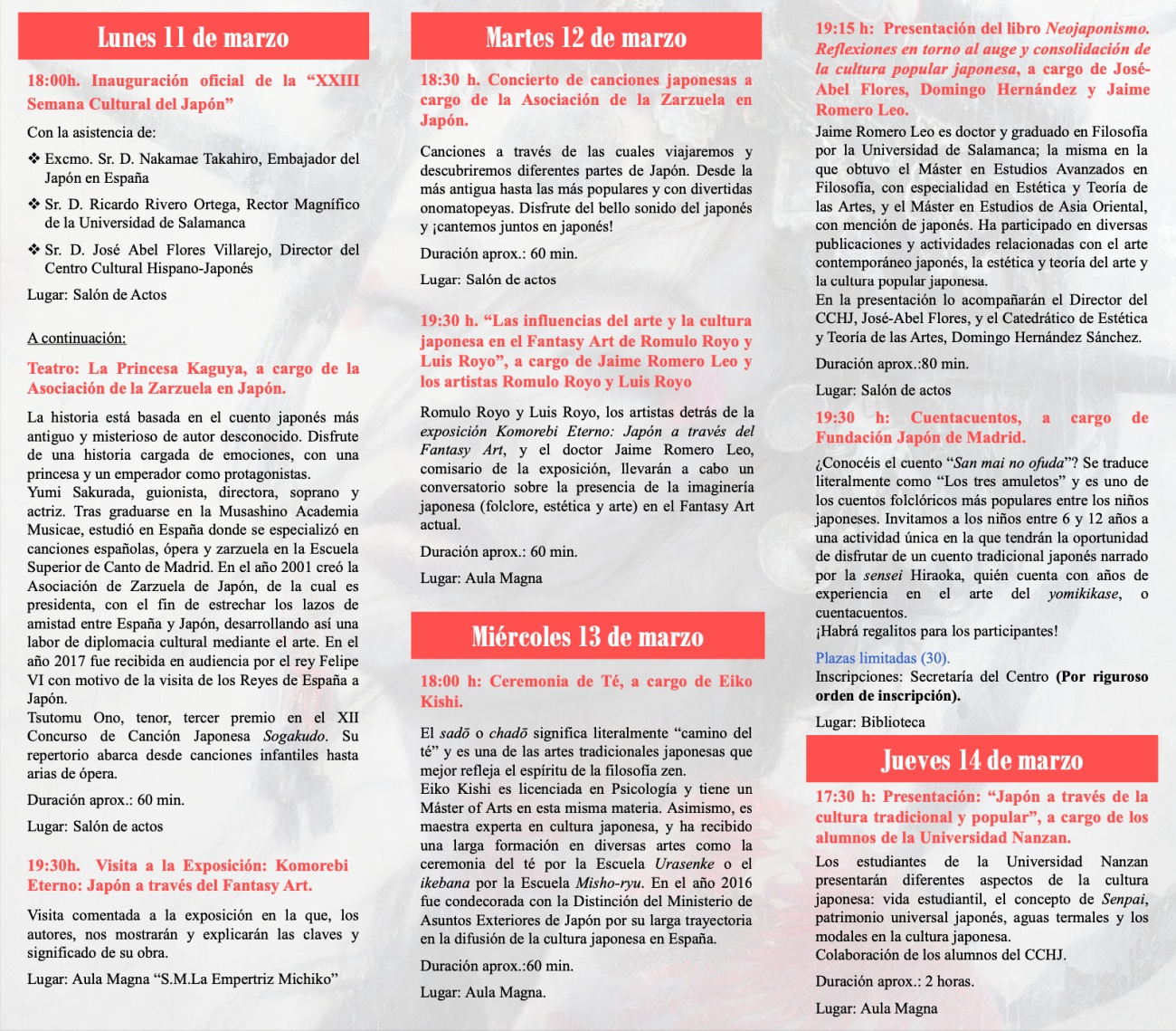 今年の日本文化週間では開催期間中の午後、全12のイベントが企画されている。初日の3月11日の開幕式では、2020年パンデミックで延期となった日本サルスエラ協会による音楽劇「かぐや姫」が4年越しに上演。さらに同協会は翌12日に日本歌曲のコンサートも行う。13日にはお茶席のデモンストレーションが開催されるが、こちらは大人気イベントのため早めの来場をお勧めしたい。そして最終日の15日にはサラマンカ大学友の会の協力により、神奈川大学講師による作家・泉鏡花についての講演が開催される。