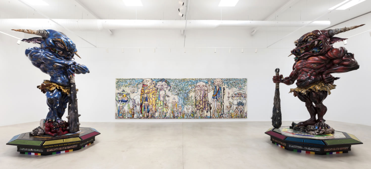 Arhat(羅漢)をテーマにした絵画作品の一つで幅10メートルを超える大作 “69 Arhats Beneath the Bodhi Tree” (2013) と、阿吽(あうん)をテーマにした2体の大きな彫刻Embodiment of “A” ・Embodiment of “Um” (2014) を、Lune Rouge Ibizaの展示室で観賞することができる。