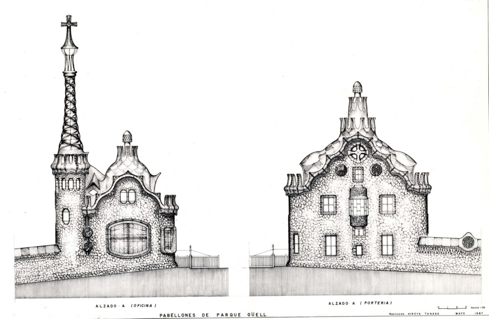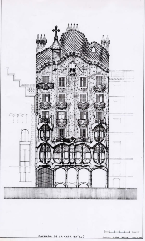 En 1978, Tanaka inicia una investigación sobre la arquitectura de Gaudí con la realización de planos hasta ese momento inexistentes mediante medición directa y el estudio de la geometría. Esto le llevará a realizar una extensa obra de dibujos con mediciones in situ utilizando la metodología clásica del oficio de arquitecto y arquitecto técnico, como si fuera una ejecución de obra.