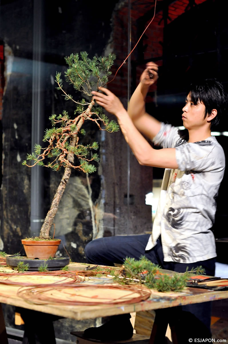 Hirao va formando las ramas del árbol con una tijera y un alambre de cobre pensando en la forma que alcanzará el ejemplar en 30 o 40 años.