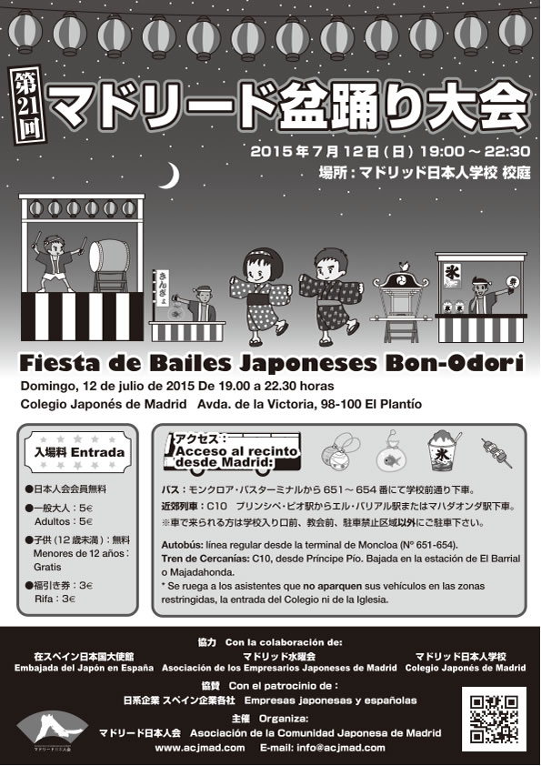 7月12日(日)19時よりマドリード日本人学校校庭にて開催される第21回マドリード盆踊り大会のプログラムが、下記のように決定した。