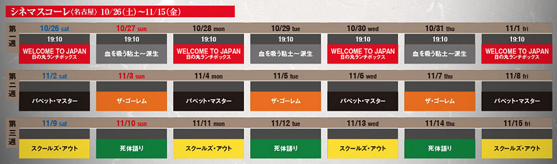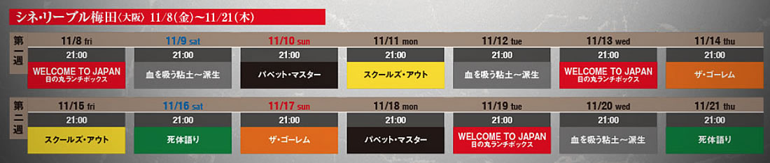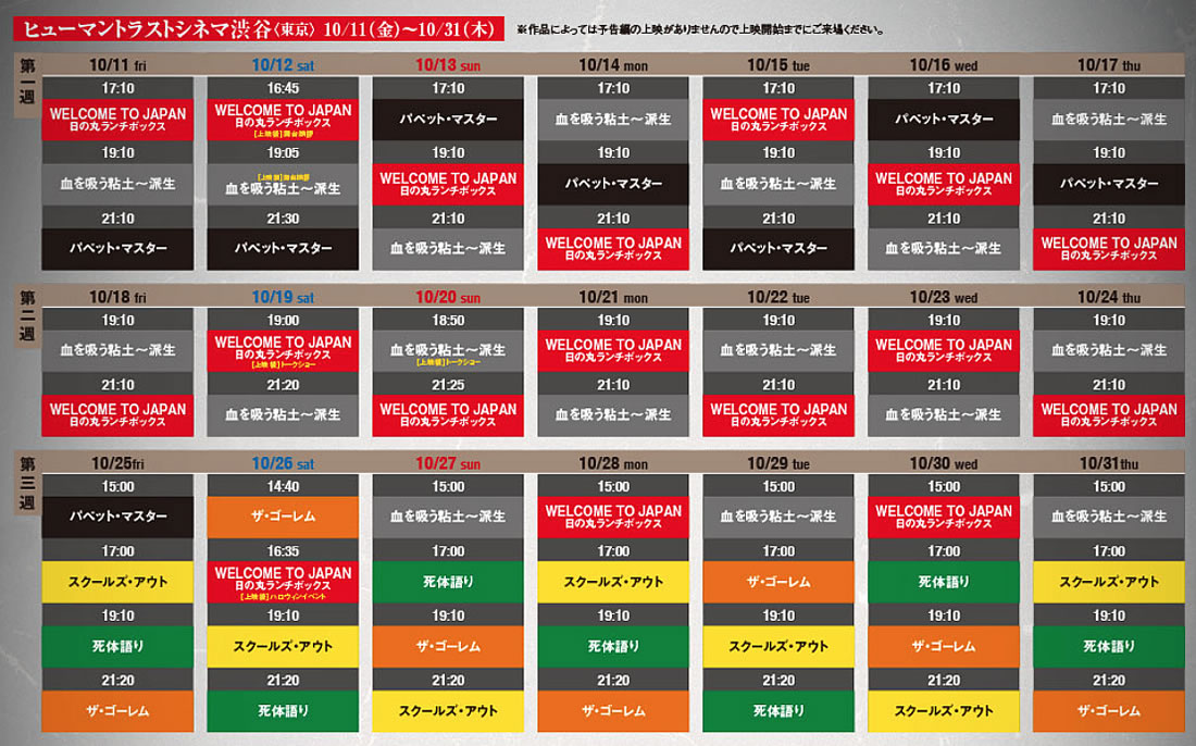 本年度のラインナップは、大ヒット人形ホラーの30周年記念作品「パペット・マスター」、西村喜廣監督・藤田恵名主演「WELCOME TO JAPAN 日の丸ランチボックス」、フレンチ学園スリラー「スクールズ・アウト」、超能力ミステリー「死体語り」、伝説の泥人形ホラー「ザ・ゴーレム」、梅沢壮一監督による人気作の続編「血を吸う粘土~派生」の6作品。