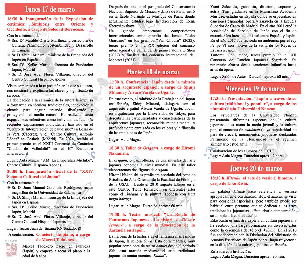 日本文化週間では開催期間中、全11のイベントが企画されている。初日17日20時よりフアン・デル・エンシナ劇場で開会式を開催。また、これに先立ち同日18時半から、陶芸展覧会の開会式をサラマンカ大学日西文化センターにて実施予定。