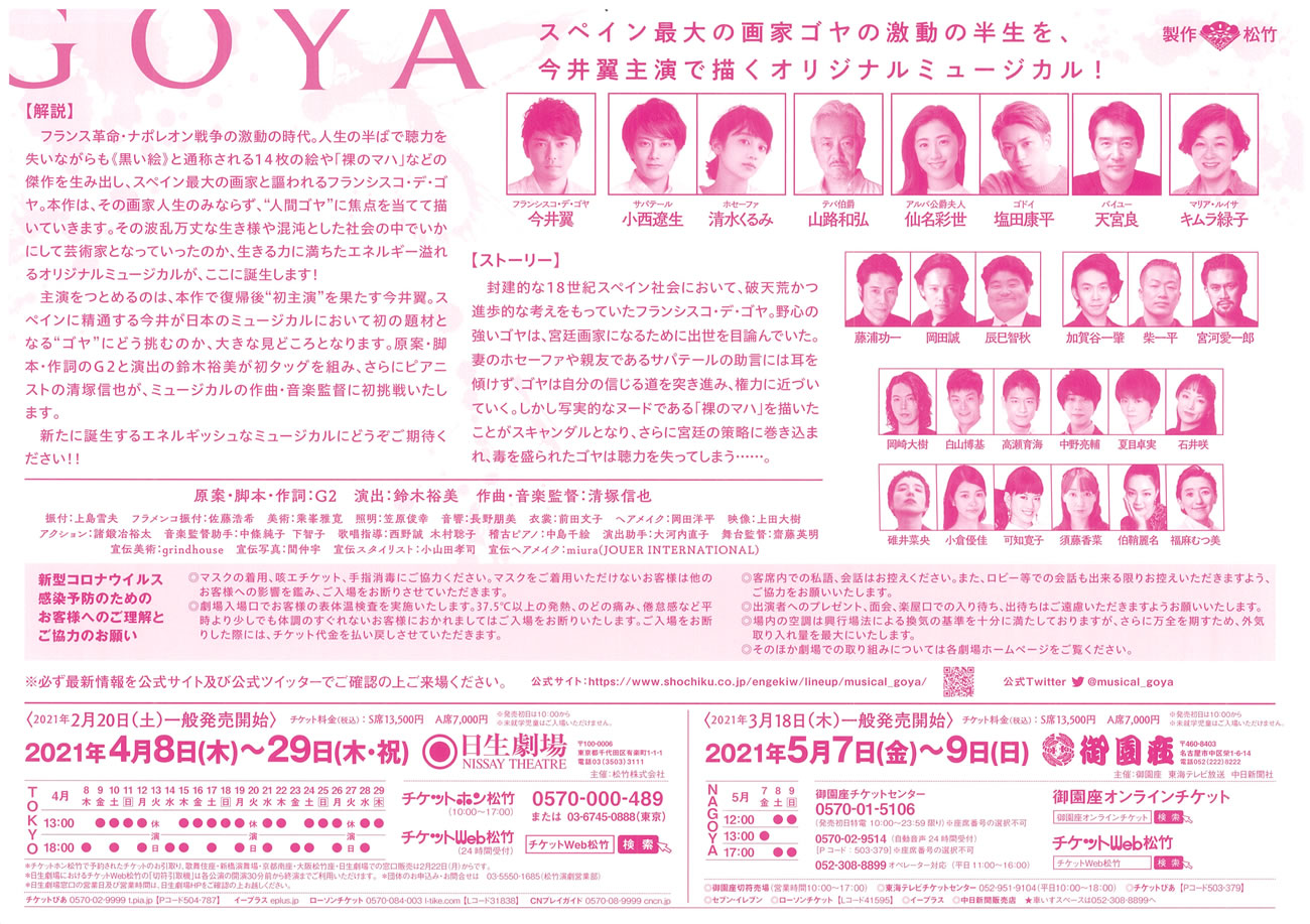 La productora japonesa Shochiku Co.,Ltd. presenta el Musical “-GOYA-”, en el que se cuenta la vida turbulenta del pintor español. Del 8 al 29 de abril se podrá disfrutar de esta obra desafiante en Nissay Theatre (Tokio) y en Misonoza (Nagoya) del 7 al 9 de mayo.