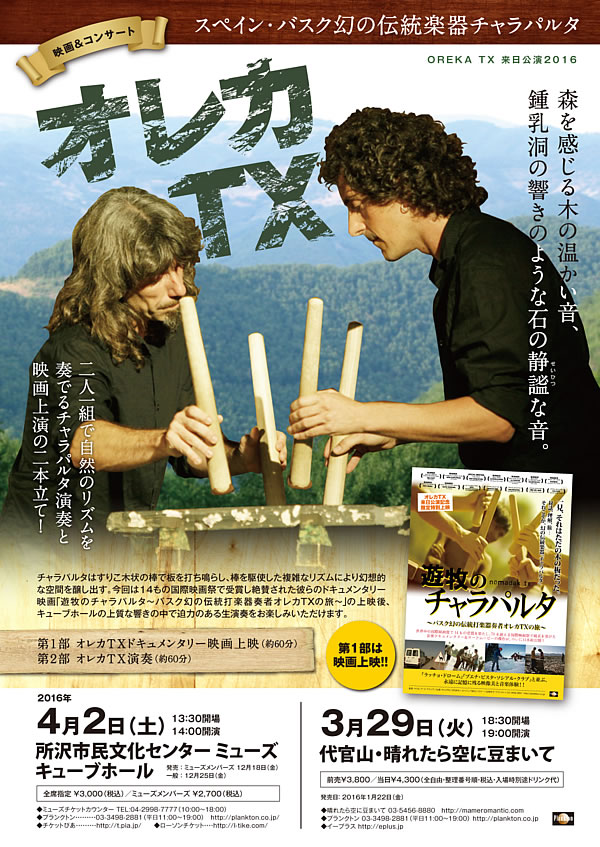 La txalaparta es un instrumento de percusión tradicional del País Vasco y Oreka TX es embajador de la música de este instrumento. Durante su gira, Oreka TX actuará en diferentes escenarios de Japón, colaborando con Motoko Hirayama, bailarina y coreógrafa, y con Emi Toko, cantante ainu (pueblo indígena de Japón que vive principalmente en la isla de Hokkaido y Norte de Tohoku). Algunos conciertos estarán combinados con la proyección de la película documental “Nomadak Tx” protagonizada por este dúo.
