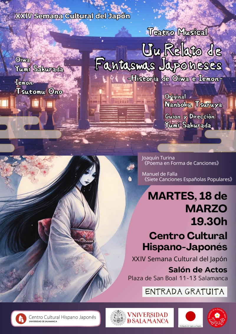 Yumi Sakurada, una japonesa dedicada a la zarzuela presenta una función corta y comprensible de una historia sobre las emociones, el amor y la lujuria del periodo Edo. Este relato de fantasmas aterrador y divertido es apto tanto para niños como para miedosos. ¡El reparto de universitarios internacionales de la Universidad de Salamanca también está muy activo! ¡No se lo pierdan! ¡Que lo disfruten!